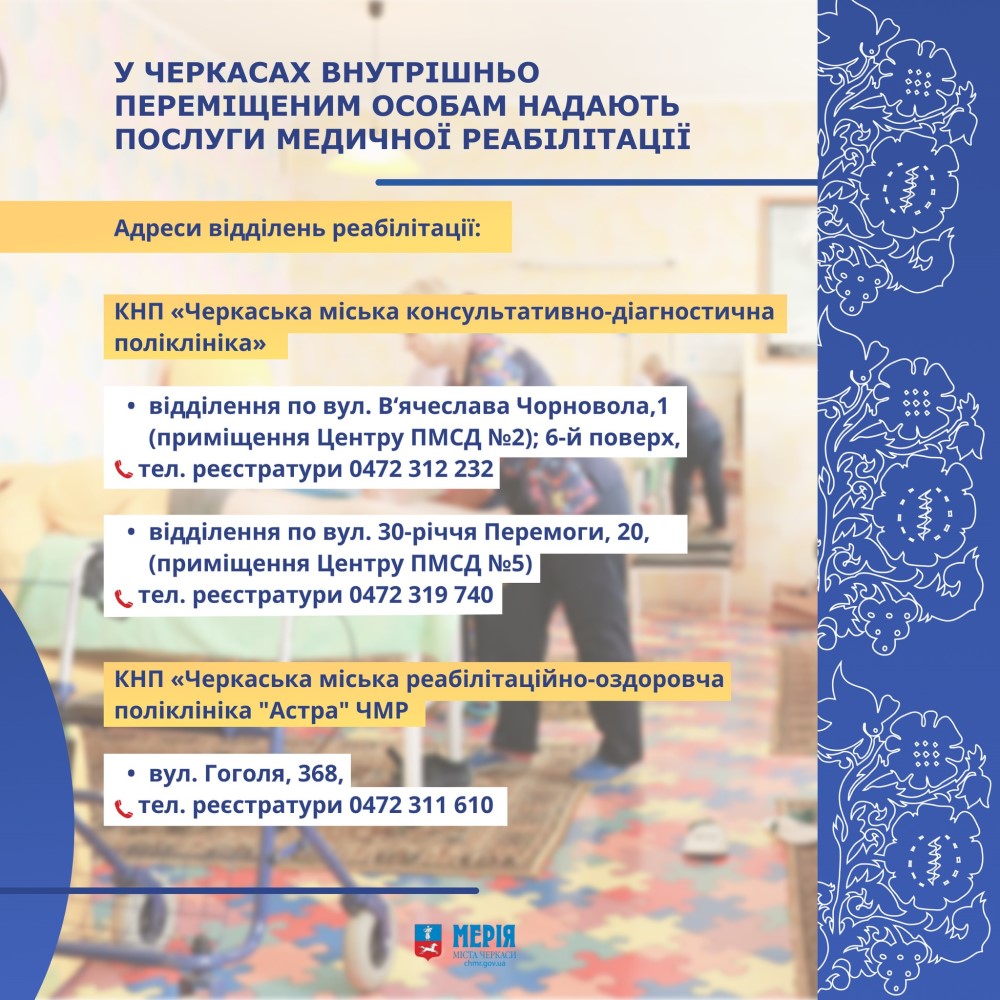 Люди, які переміщуються з тимчасово окупованих територій та районів бойових дій, у лікувально-профілактичних закладах Черкас можуть отримати медичні послуги (стаціонарно і амбулаторно), зокрема, медичну реабілітацію для відновлення здоров’я.