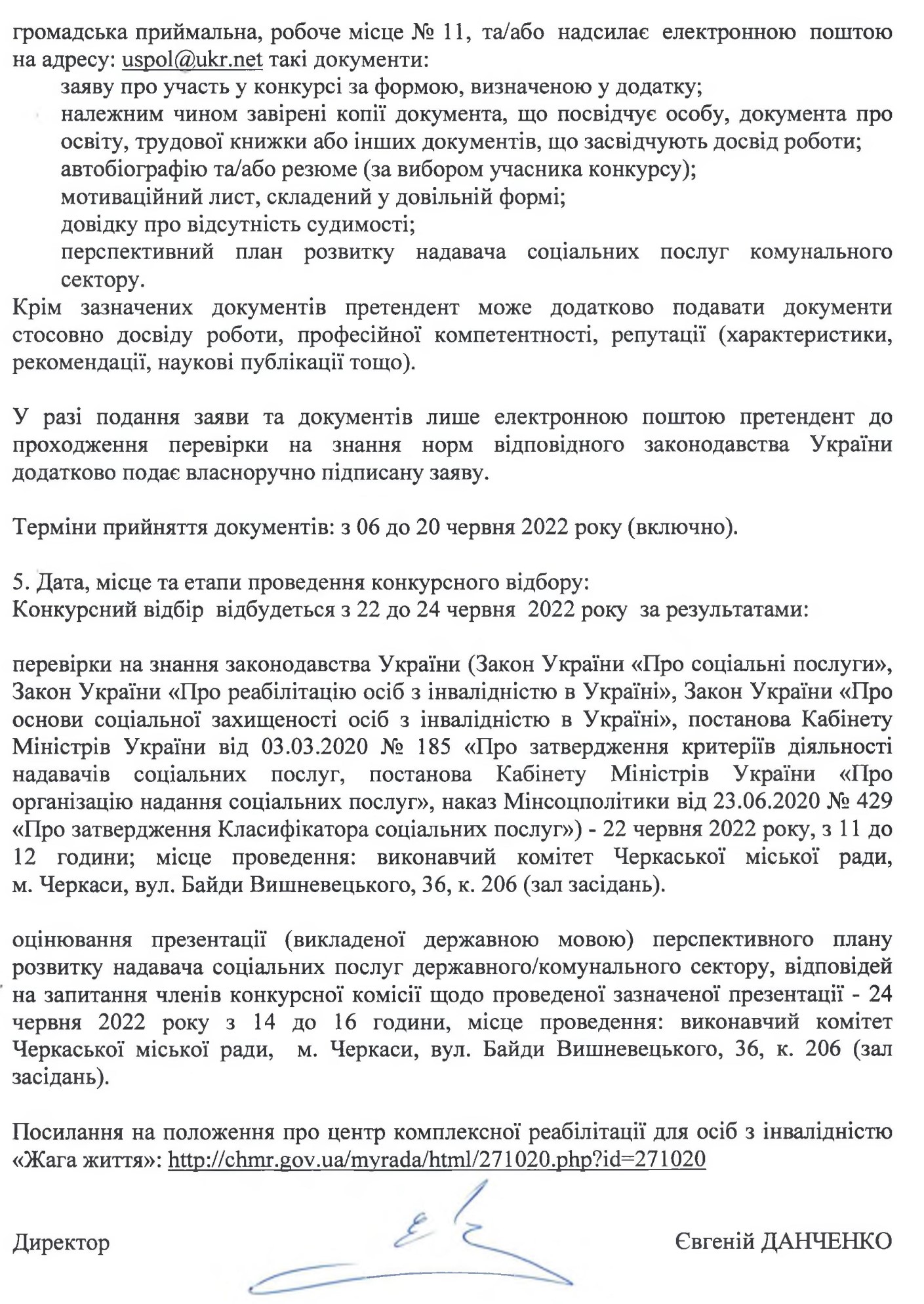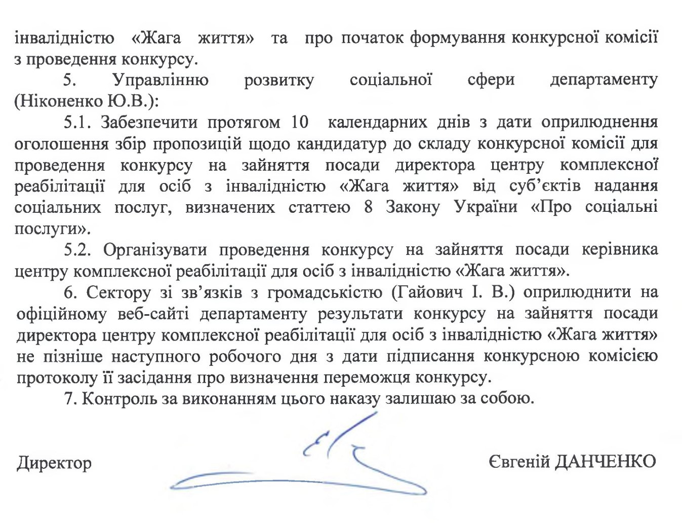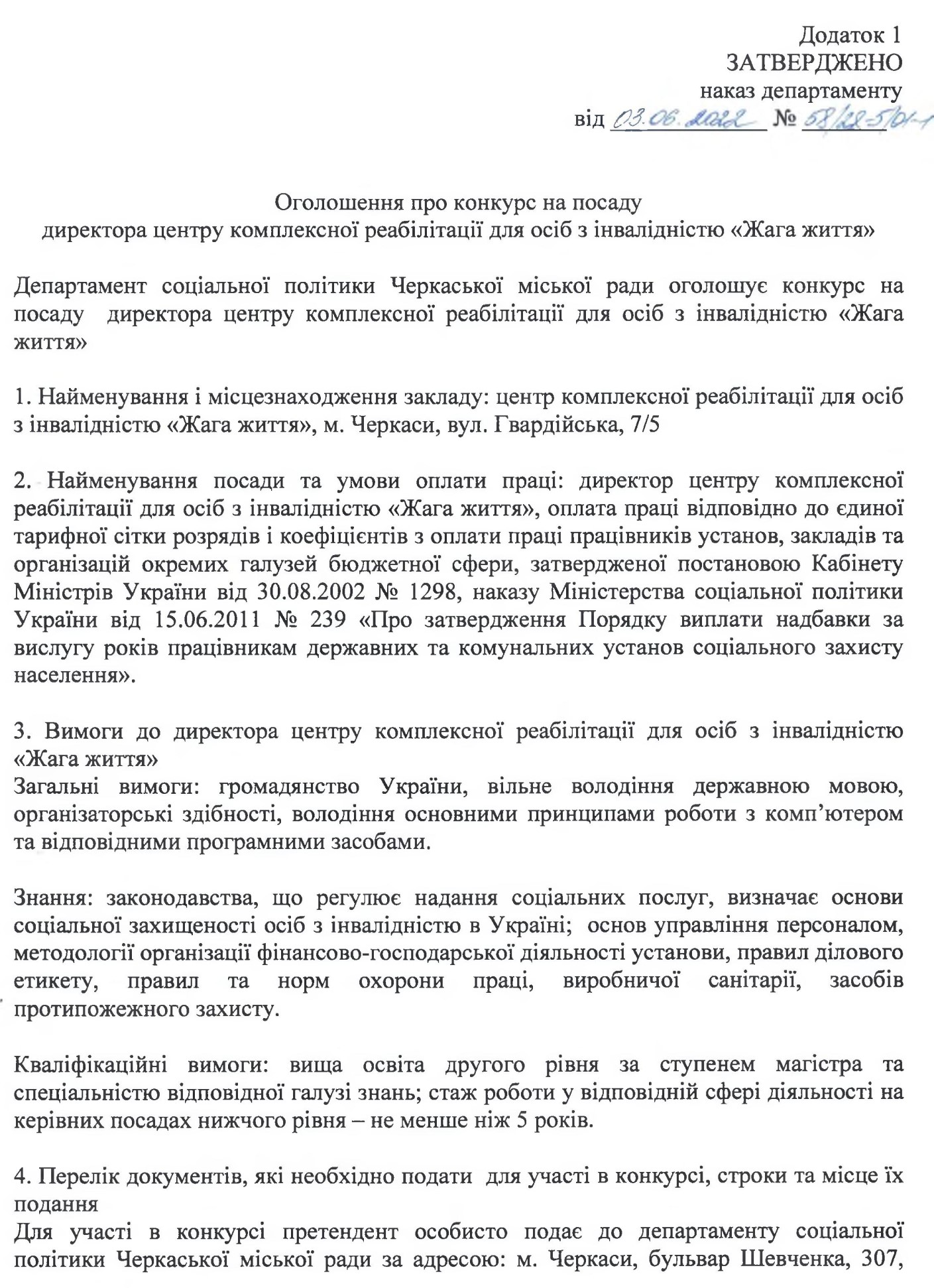 Оголошується конкурс на зайняття посади директора центру комплексної реабілітації реабілітації для осіб з інвалідністю "Жага Життя"