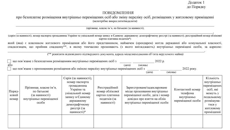 Особи, що розмістили внутрішньо переміщених осіб, також зобов’язані в день припинення розміщення внутрішньо переміщених осіб або зміни їх кількості подати повідомлення з інформацією про зміну переліку осіб, розміщених у житловому приміщенні, із зазначенням можливості у подальшому розміщувати внутрішньо переміщених осіб у такому приміщенні.