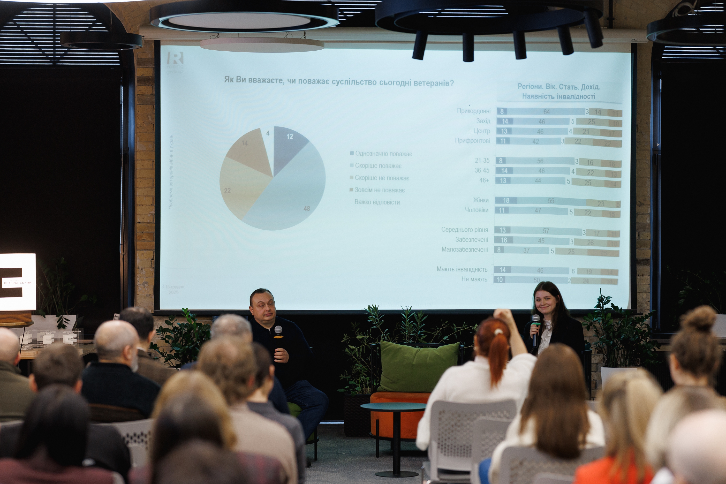 Водночас самі ветерани оцінюють ситуацію стриманіше: 60% вважають, що суспільство сьогодні поважає ветеранів, тоді як 36% дотримуються протилежної думки. Дослідники зазначають, що між суспільним образом ветеранів і їхнім власним відчуттям існує певний розрив, однак він має природний характер і не створює конфлікту.